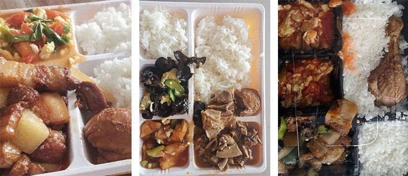 ▲發(fā)放盒飯,單桌用餐,不準(zhǔn)交叉,防止感染